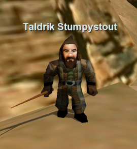 - Taldrik Stumpystout says, 'Move along dere yer blocking me view lad. I await me friend that has gone off to fetch me some water. It sure is hot out here.'