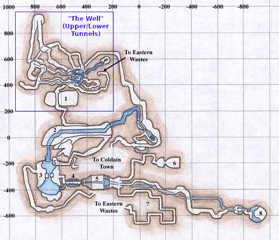The Crystal Caverns are the ancient home of the Coldain, named Froststone, long since overrun by giants and now orcs and other creatures. There are five areas within the tunnels, each controlled by either the Ry'Gorr orcs, the geonids, the stalag terrors, the crystal spiders, or the Coldain dwarves. The orcs control the upper parts of the tunnels, the dwarves the small remnants of their city, the terrors some abandoned halls, the spiders also some abandoned halls, and the geonids a set of tunnels they created for themselves.