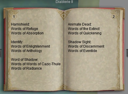 Recipes for necromancer spell research. Includes the recipe for Hamshield, which is a typo of Harmshield. Item appears to be written in Elder Teir'Dal.