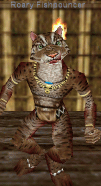 Roary Fishpouncer says, 'Rrrr... my mouth is waterrring alrrrready. Ourrr trribe shall feast well tonight. You have prrroven yourself a fisherrrman worrrthy of one of my special spearrrs. They are coated with a specially prrrepared fish oil. When all the oil has washed off, you may rrreturn the spear to me along with a frrresh fish and I will rrreapply the oil for you.'