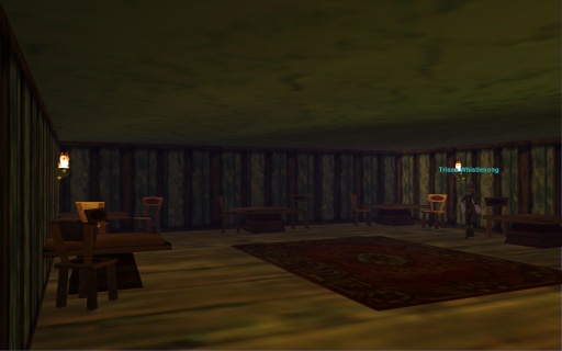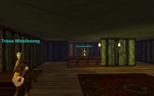 Just inside is the inn's front desk, but make a quick left and you'll find a large room lined with numerous tables and chairs. Drona Whystlethin is working behind the bar offering a decent selection of many Antonica favorites, including the infamous Capt. Orlin's Spiced Ale. A lady bard is also stationed here, showing off her impressive dual-wielding lute skills. Luckily there's plenty of open floor space available for dancing along to the tunes.