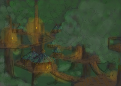 The remaining Wood Elves were heart-broken but not beaten. They began construction at once on an even more magnificent home. Slowly, one of oldest and most respected rangers, Kele, put together a team of rangers to distract the orcs while the others worked on the nascent city. Dispite attacks from both the orcs and the native fae, the Wood Elves build many platforms and huts high above the forest floor. Once there were enough homes for everyone, the community moved in there, and christened it "Kelethin," Elvish for "Child of Kele."