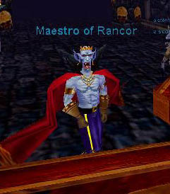 The Maestro of Rancor is the guardian of Innoruuk, and resides within the Organ Hall in the Plane of Hate. The many items he carries tend towards those usable by bards. After Hate revamp upon death he will spawn Hand of the Maestro (Mob) and after that dies it will spawn a very unpleasant hand.