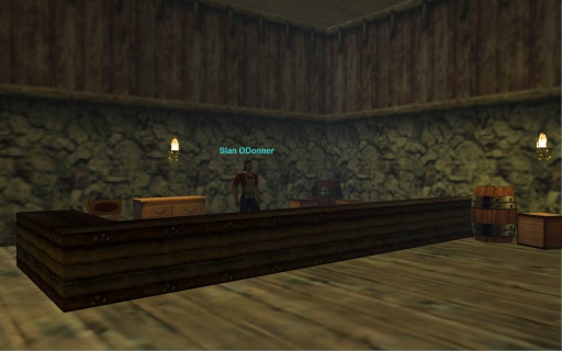 Nestled tightly between Trader's Holiday and Velithe & Bardo's Imported Goods there's a nondescript building accessible through a nondescript alleyway. Inside is a one-roomed tavern with multiple tables with chairs, a large service bar, storage rates, and quite high ceilings. The bartender here goes by the name Slan ODonner. It's interesting that the rest of the "O'Donner" family are who operates Velithe & Bardo's Imported Goods just next door (Monita O`Donner, Myrissa O`Donner, Ston O`Donner). This raises many questions. Why is Slan over here in this empty unlabeled building? Why is his surname missing the apostrophe? Why is his name so similar to Ston? Why are there frequently at least two guards idling outside of his bar's entrance-way?