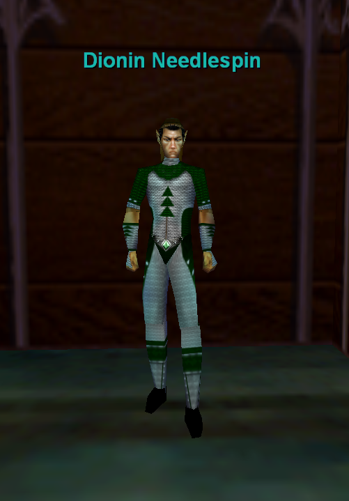 - Dionin says, "Greetings my friend. I am the tailor of this outpost. We have limited supplies. I often have to preserve my tailoring supplies to [mend very large items]."