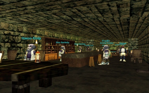 Going back to the soundtrack, one quite interesting note about The Velium Keg is it's soundtrack. There are actually multiple songs that play in the bar. Most of the time it's a more up-beat cantina sounding tune with prominent drums, piano, and woodwinds/horns, but occasionally it switches to a much slower song more traditional in other parts of Norrath. Both songs are definitely isolated to the bar, as they quickly fade away when you leave the door and there's no other city-wide song played in Thurgadin. Perhaps based on time of day or perhaps random, hang around here long enough and you'll experience the ambiance of both songs.
