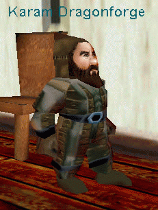 - Karam Dragonforge says 'Welcome. I have a number of platemail items, if you are interested. I am also a master [smith] of exotic materials such as dragon scales.'